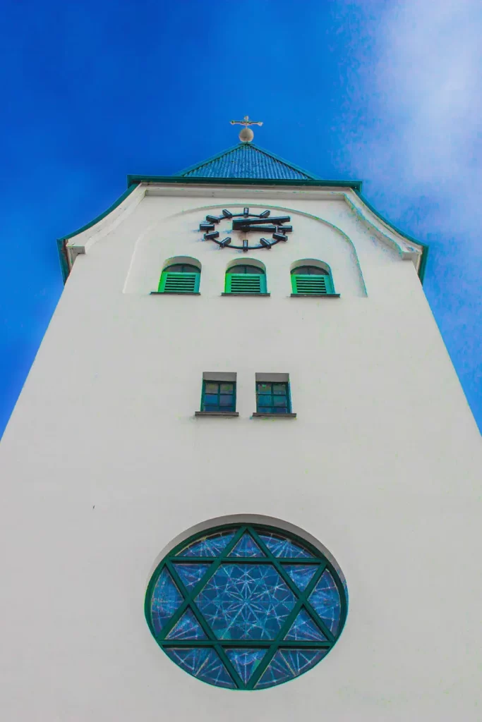 Hafnarfjörður, Islândia | Fachada frontal da torre da Igreja Hafnarfjarðarkirkja
