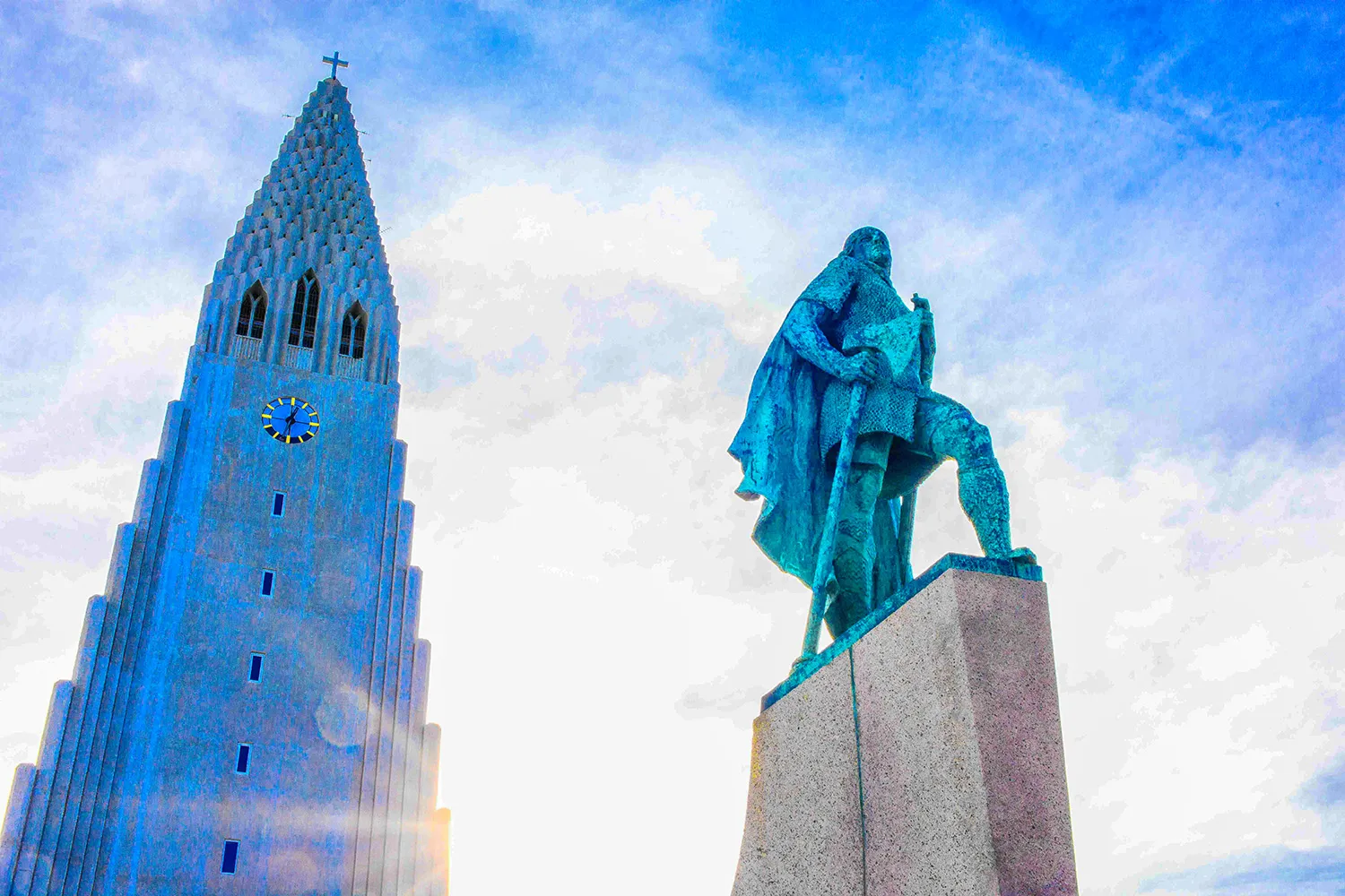 Estátua de Leif Erikson, primeiro explorador europeu da América do Norte no ano 1.000, em frente à igreja Hallgrímskirkja, em Reykjavík, Islândia.