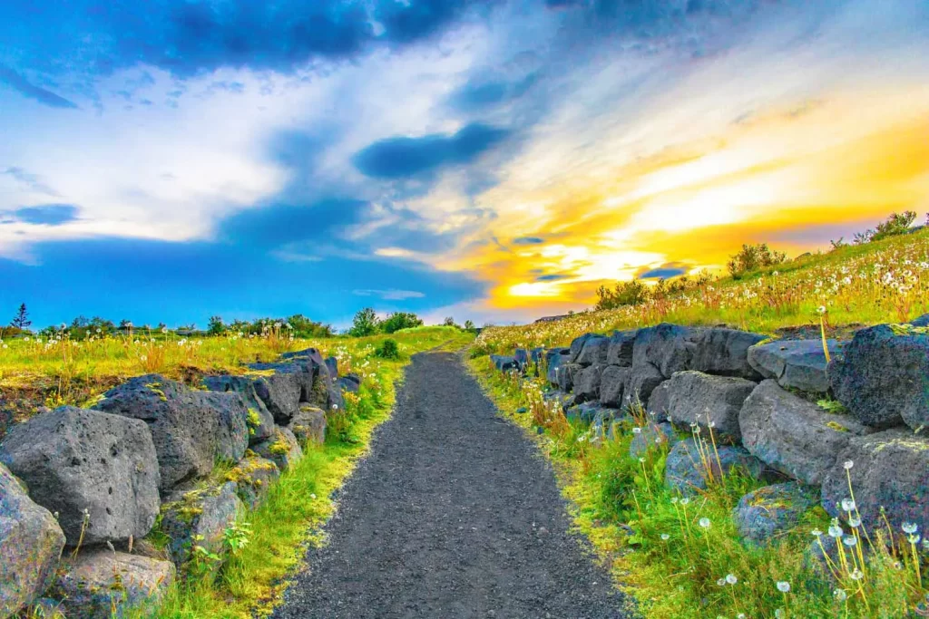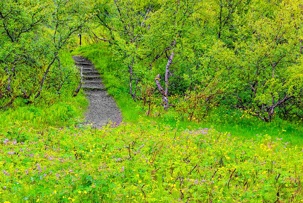 A despeito da farta luminosidade, esta foto foi feita quase às 23 horas, no auge do verão islandês, na cidade de Hafnarfjörður, região metropolitana de Reykjavik. Este caminho conduz a Hamarinn, um dos pontos mais altos dessa cidade, um local onde há muitos sinais de remotas e brutais atividades geológicas, sejam elas vulcânicas ou de movimento de placas tectônicas.