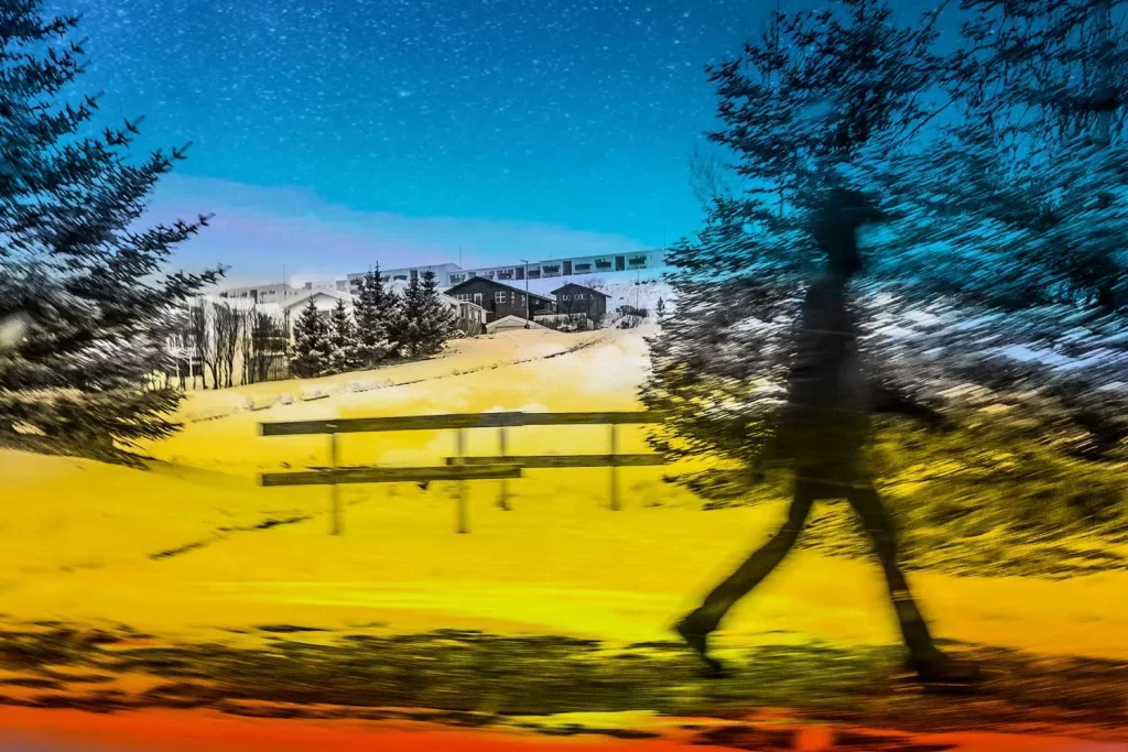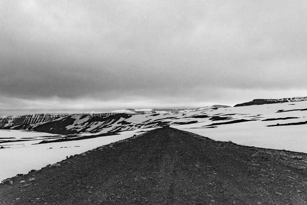 À noite, em direção à cidade de Holt, região noroeste da Islândia, local onde há a primazia dos fiords, acabei me perdendo em caminhos muito remotos e vazios. De carro, tive que interromper o trajeto ao me deparar com essa estrada que acaba em um local adornado puramente de gelo. Não havia sinal de smartphone, nem de GPS e estar sozinho em tal ambiente me fez experimentar uma realidade incontestavelmente bela, isolada, solitária e silenciosa.