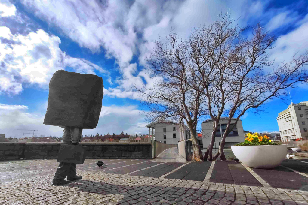 Reykjavík, Islândia | “Monumento ao Burocrata Desconhecido”. A obra, que combina a metade inferior de uma pessoa de terno carregando uma pasta com uma enorme rocha bruta no lugar do torso e da cabeça, foi criada pelo escultor islandês Magnús Tómasson em 1994.